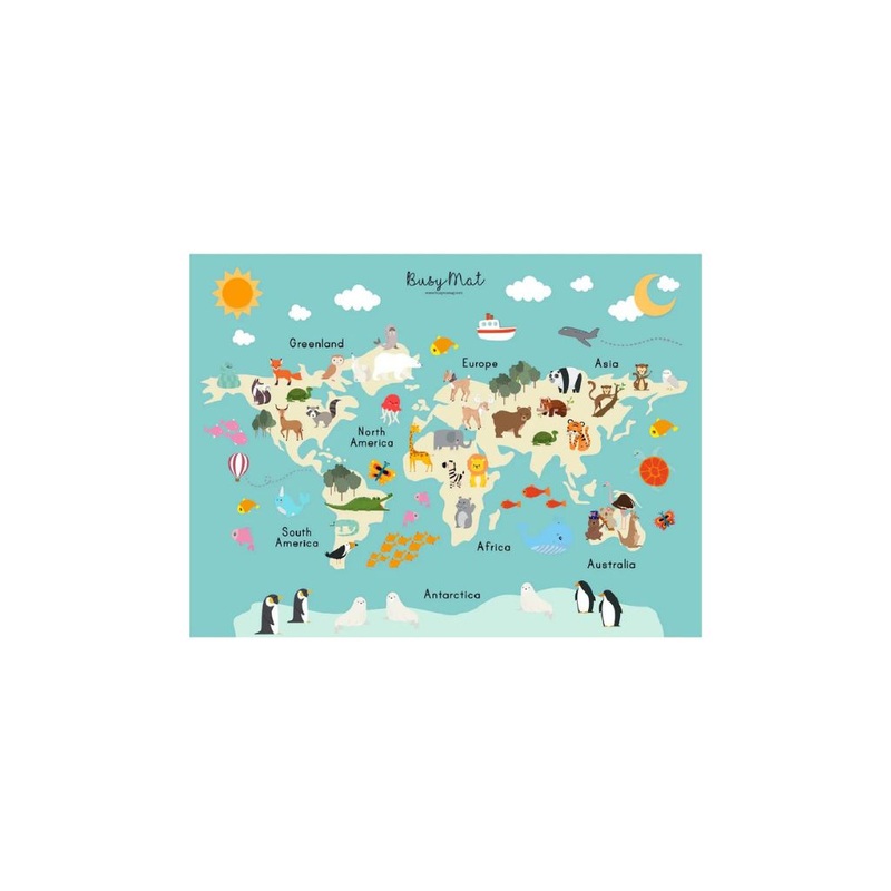 Premium Large Dining PlacematMeaningful learning of our precious world with animals around the world. Get the little ones intrigued by the animals of each country/continents. Busy Mat White Based Large PlacematMeasures: 40cm by 30cm- To wash, rinse under r
