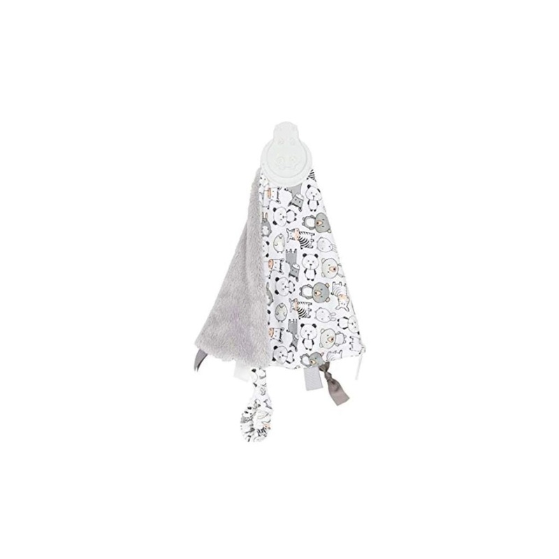 Elegant and reversible doudou, suitable from birth, includes a teether, sensory tags to help the baby's sensory development and a small bracelet to attach the doudou to the wrist or stroller.