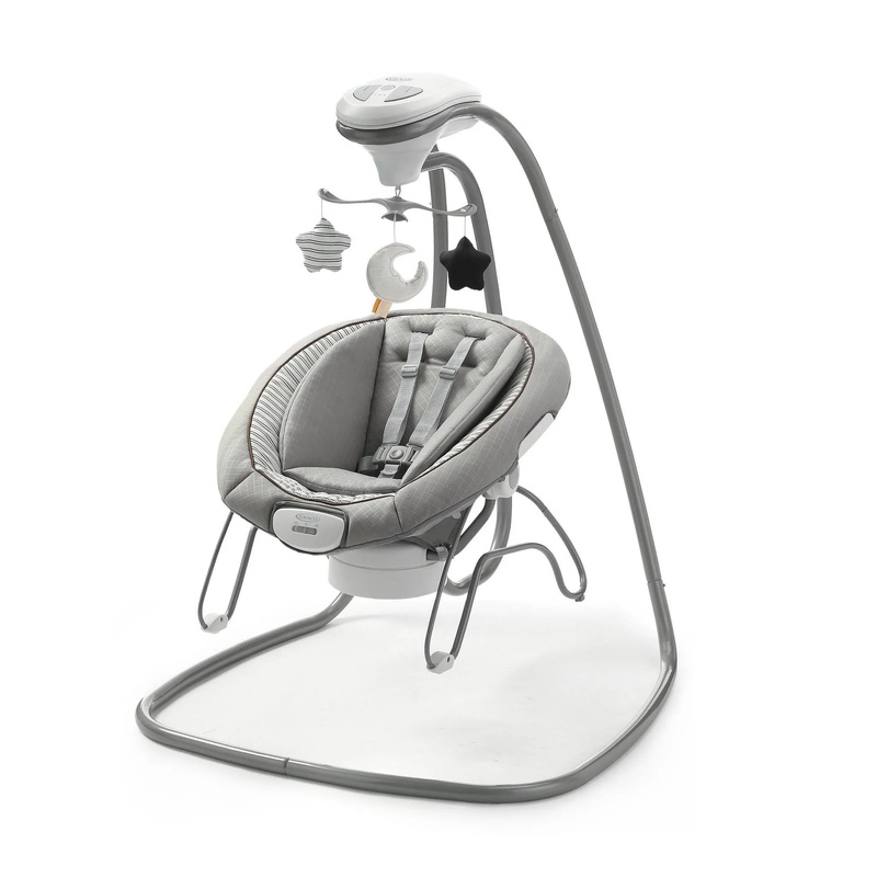 The Graco DuetConnect Deluxe Baby Swing with Portable Bouncer is a 2-in-1 baby swing and bouncer that allows you to keep baby soothed by your side. The swing features a gentle swaying motion and a 3-position seat for side-to-side or front-to-back swinging. This soothing swing features a variety of songs and sounds to help your little one relax, while its 2-speed calming vibration helps to further comfort baby. This baby swing also includes removable, machine-washable fabrics to help keep cleanup simple.