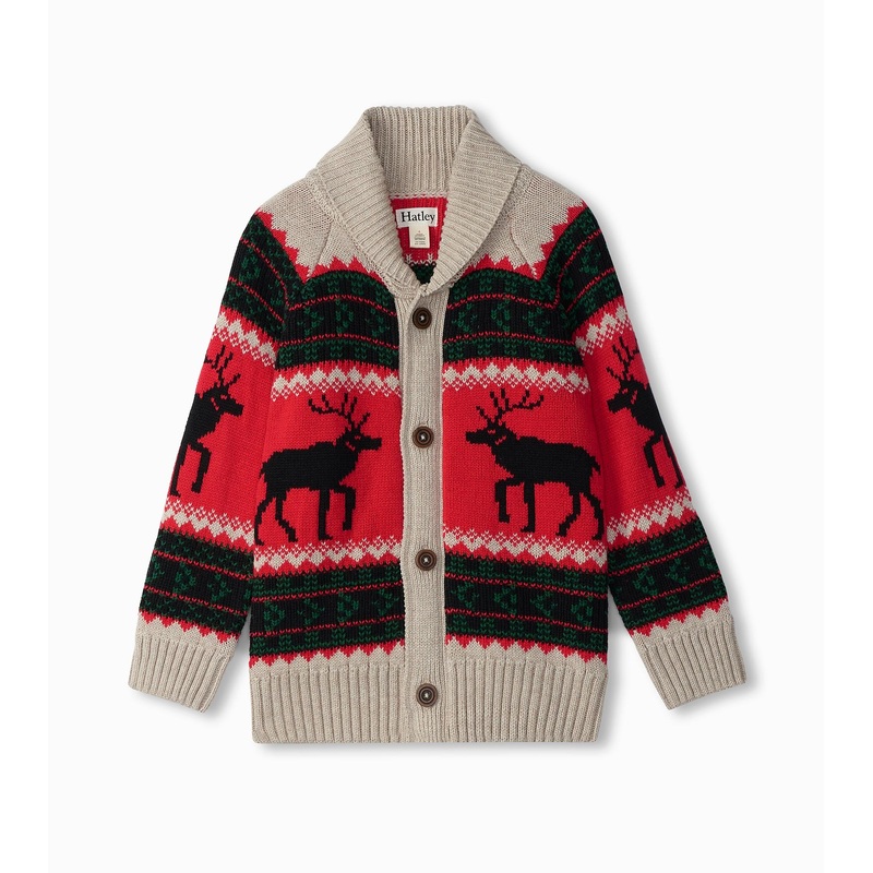 Cozy and comfortable button up cardigan sweater withstag design.Rib single set-in shawl collarFull needle set-in placket with a full needled taping for stabilityFour button center front placketLong raglan sleeves with a rib self cuffs at opening60%cotton40