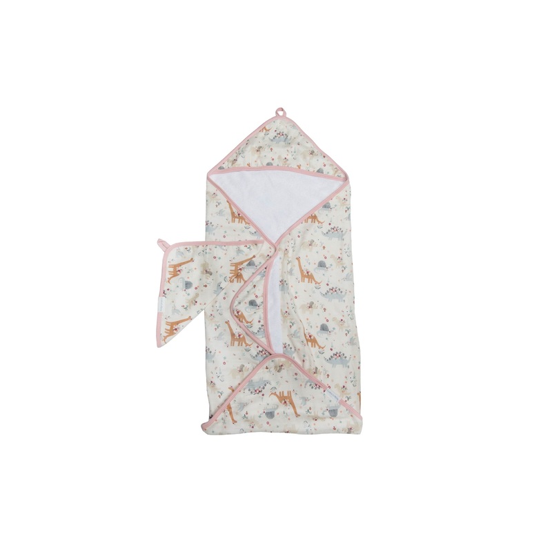 Hooded towel measures 32″ x 32″, and washcloth measures 12″ x 12″.