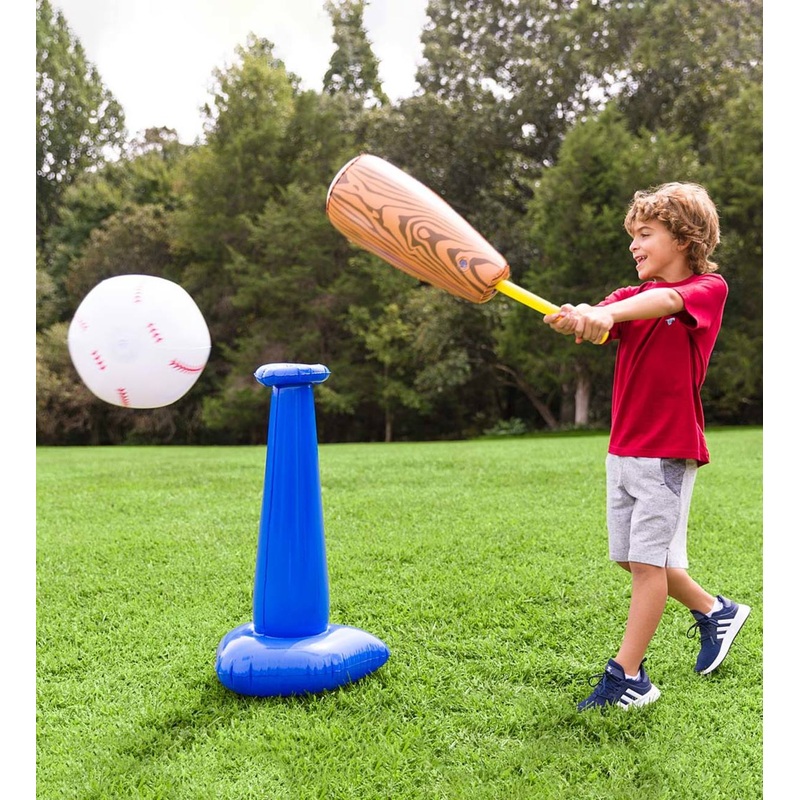 Oversized inflatable T-ball setLarger-than-life fun for the whole family!Great for active outdoor play3-piece set (inflated) includes a 31"H stand, 26"L bat, and 11" diam. ballGiant components inflate and deflate easily (pump sold separately)Enjoy hours of