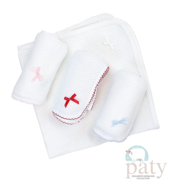 Solid white signature Paty knit accented in blue picot trim and blue bows. Perfect for hospital announcements and everyday coziness!
