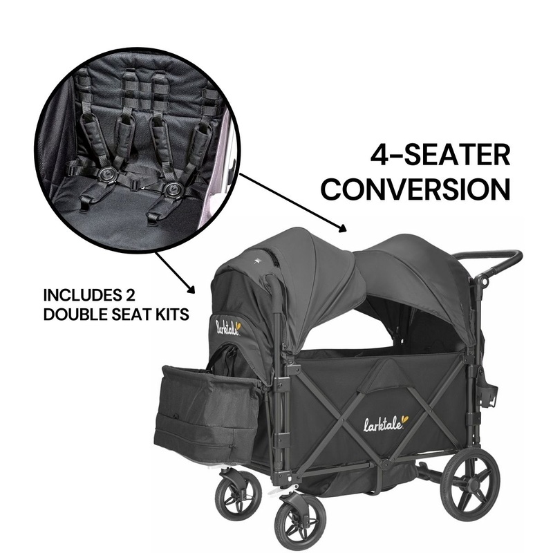 Simply attach the included double seat kits to each seat of the Caravan to make your caravan a 4-seater, toting around your littles and their closest friends.Your little Larktale riders can weather it all with the included multi-purpose sun canopies for the Larktale caravan stroller/wagon. This set of two sun canopies attach to protect each seat individually with a UPF50+ rating. Each sun canopy set features built-in protective rain and bug covers that extend over the entire caravan but cleverly stow away when not in use.