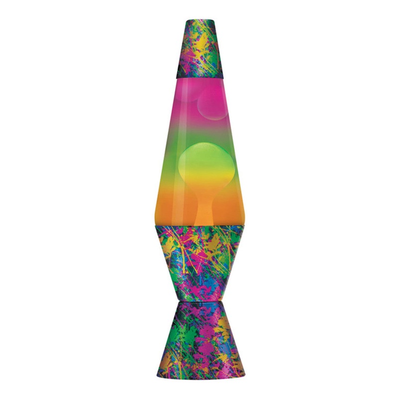 Hypnotic and cosmic. Classic and modern. The infamous Lava Lamp fills your room with a cool artistic vibe, now in rainbow! Includes 25-watt bulb. Base has appealing paintball decal and stands 14.5 inches tall, with white wax suspended in clear liquid, within a hand-painted tri-colored glass globe. Be sure to follow safety instructions in package.
