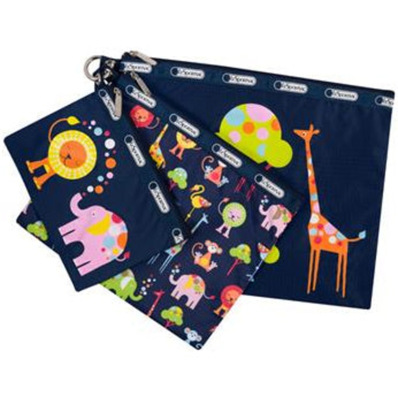 Set of three top zip closure pouches with metal release ring attachmentSmall Pouch: 6.50 x 9 in, 16.51 x 22.86 cmMedium Pouch: 9.50 x 11.50 in 24.13 x 29.21 cmLarge Pouch: 11.5 x 14.5 in, 29.21 x 36.83 cm