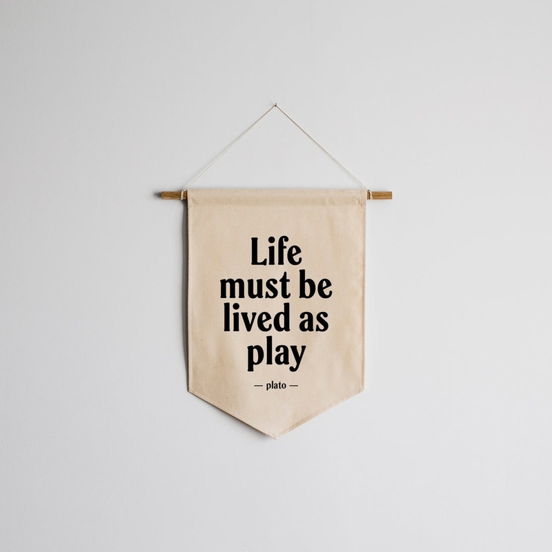 "Life Must Be Lived As Play" - Plato. Add texture and personality to your walls with these wise words from Plato. This modern banner is a lovely mix of neutral, natural materials - including canvas, oak wood, and cotton twine - with all materials sourced i