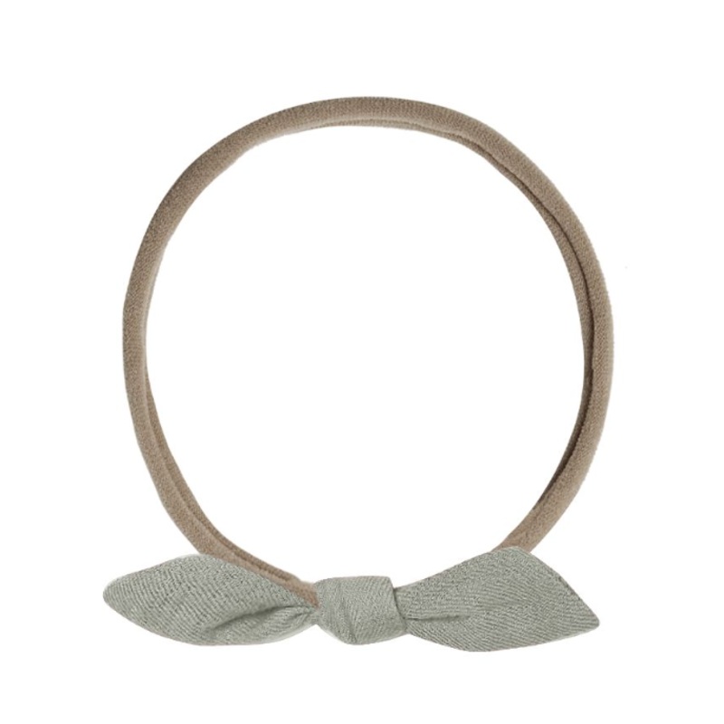 Little knot bow on a thin tan headband in ‘basil.’