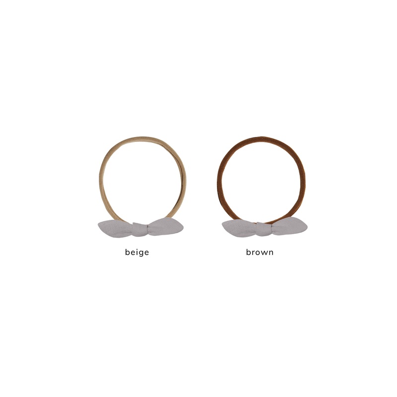 Little knot bow on a thin beige or brown headband in ‘periwinkle’.