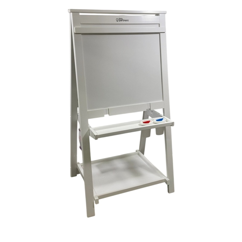 Condition: Open Box This foldable 2-sided toddlers painting easel encourages creativity with its chalkboard, dry erase board, and paper roll. Made with birch LVL wood, this sturdy easel includes non-spill paint cups, paper clips, an eraser, and storage she
