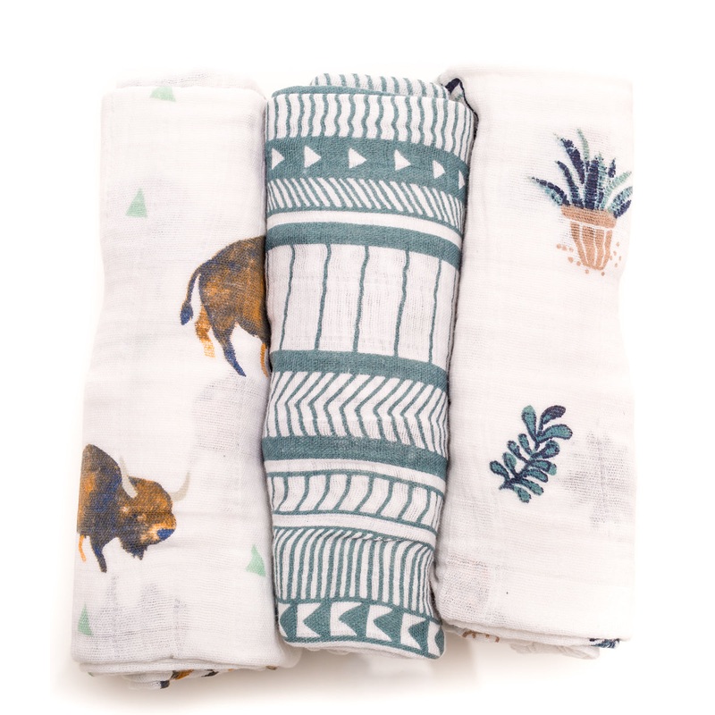 Snuggle time available daily. A versatile design that?s great for swaddling, nursing, cuddling, and more. Three 47" x 47" swaddling blankets 100% cotton muslin Lightweight and breathable Softer with each wash Machine washable Set includes Bison swaddle, Sa