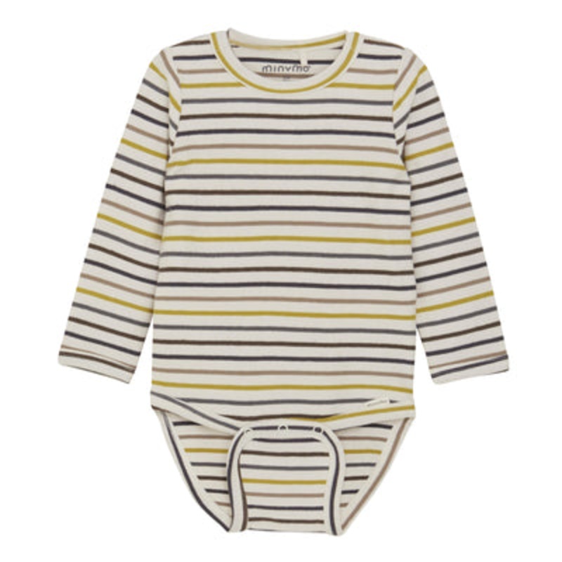 A fun striped bodysuit for babies from the Minymo brand. Start fall with this long sleeve garment that, although it is a bodysuit, cann be used as an outer shirt. Buttons on the collar for easy dressing.Fastened with snaps for east diaper changing.95% Cott