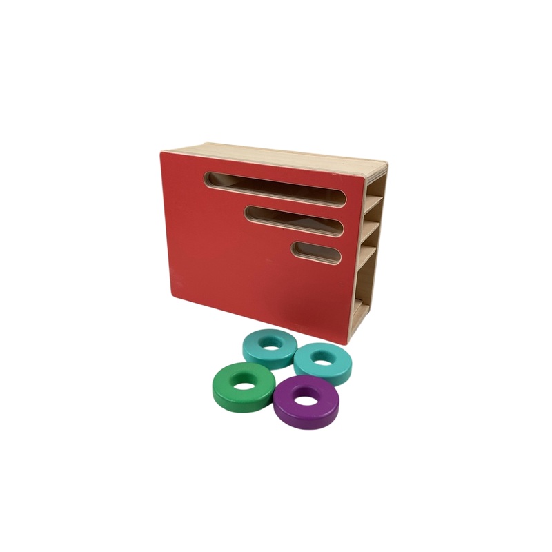 Let your toddler explore the consequences of adding more weight into the box. See how many rings you can slide through the slots before one comes shooting out!