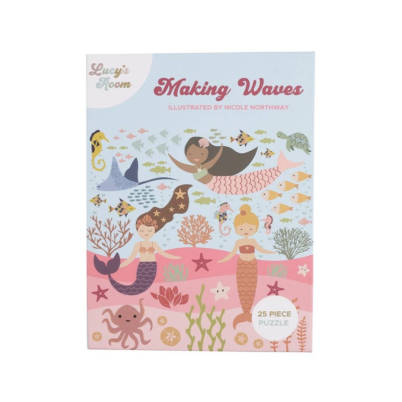 Little Ones will love the NEW Making Waves puzzle from Lucy’s Room, featuring characters from the Making Waves Emerson and Friends mermaids print. This puzzle is a fun and engaging way to visit your mermaid friends every day.