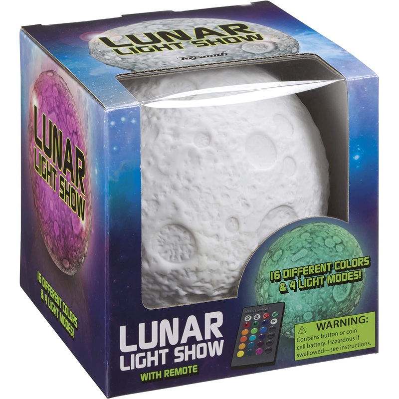 Create your own Lunar Light Show with this detailed 4-1/2" diameter orb.The remote works up to 16 feet away and features 16 different colors and 4 modes.When switched Off the moon is whiteThis item requires one CR2025 and three AAA batteries which come inc