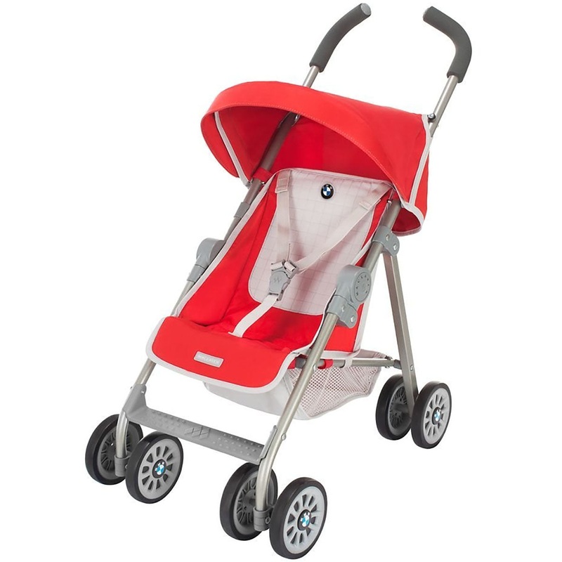 The BMW play stroller is perfect for your little one to reign over the playground. Featuring automotive inspired design. this stroller has a sturdy steel frame, swivel wheels, retractable sun canopy with storage pocket, 3-point harness, storage basket and footrest. Each BMW junior stroller comes with a coordinating toy diaper bag and fits dolls 18 inches/ 43cm.