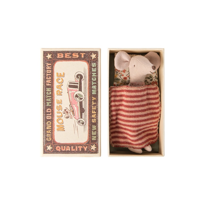 Big sister mouse is too cute with her little skirt. Her bed is always ready and she sleeps safely in her matchbox. The beautiful bedding is made of soft materials and with a beautiful print.Mouse: About 5″Box: 5.5″x 3.5″Made of cotton and polyester