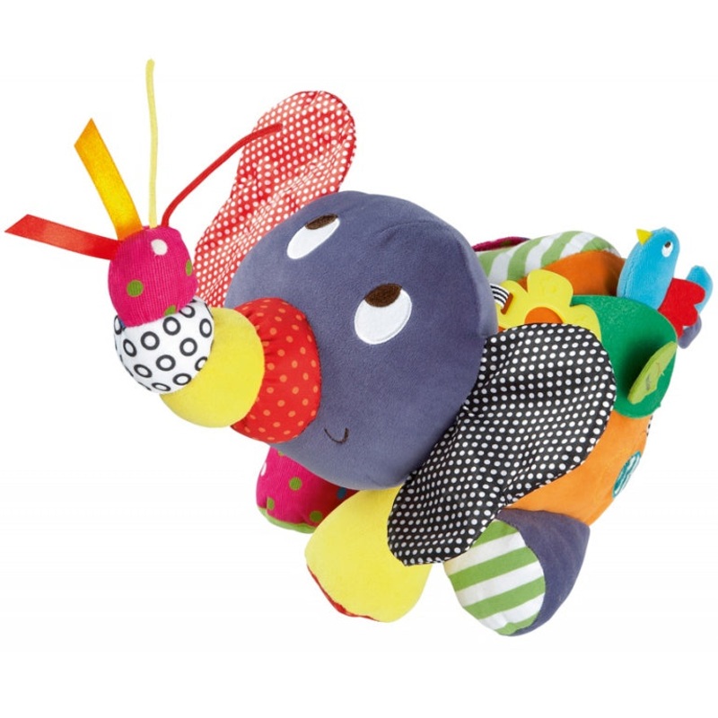 The elephant's trunk bends into different positions to help develop baby's larger and smaller muscles Pulling the hidden bird toy activates a vibrating system that helps stimulate baby's senses The teether helps to soothe sore gums Features crinkles, squea