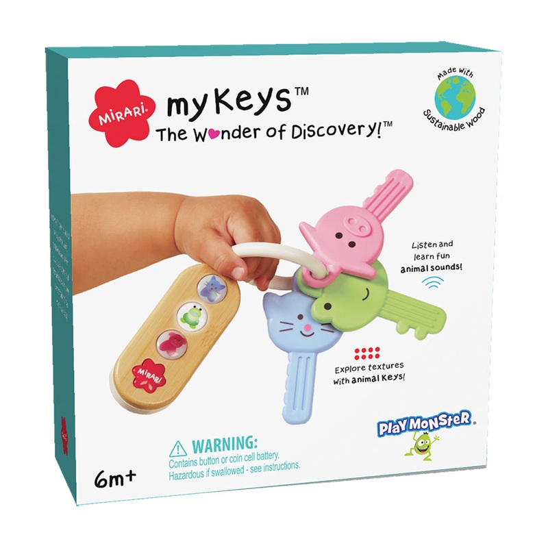 The smooth natural wood ring holds three colorful keys with food-grade silicone guards and different textures for a sensory experience. The attached fob has a natural wood top, and features light-up buttons that coordinate with the faces on the keys, so babies know which animal sound they will hear when pressed! Press the Mirari logo to activate a lovable giggle sound! Each key measures 3.6.