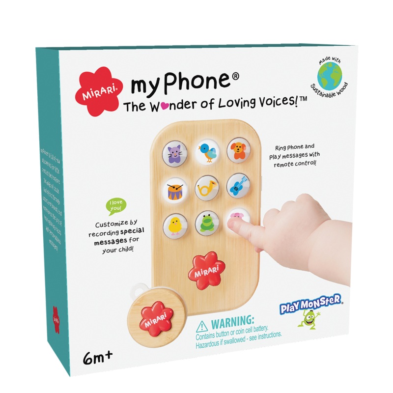 The 5 phone features nine colorful light-up icons with fun phrases and sounds that activate when pressed.The red Mirari button activates an adorable giggle! The most exciting feature of this phone is its record and ring abilitymom or dad (or grandparents!) can record a personalized message on the phone for children. Then, using the included remote, parents can activate the phone ringer from across the room (unobstructed), and children will hear their loved ones message! Its a magical addition to fun phone play that children will adore! Both the toy phone and keychain remote feature a natural wood top for a modern, rich look and feel.