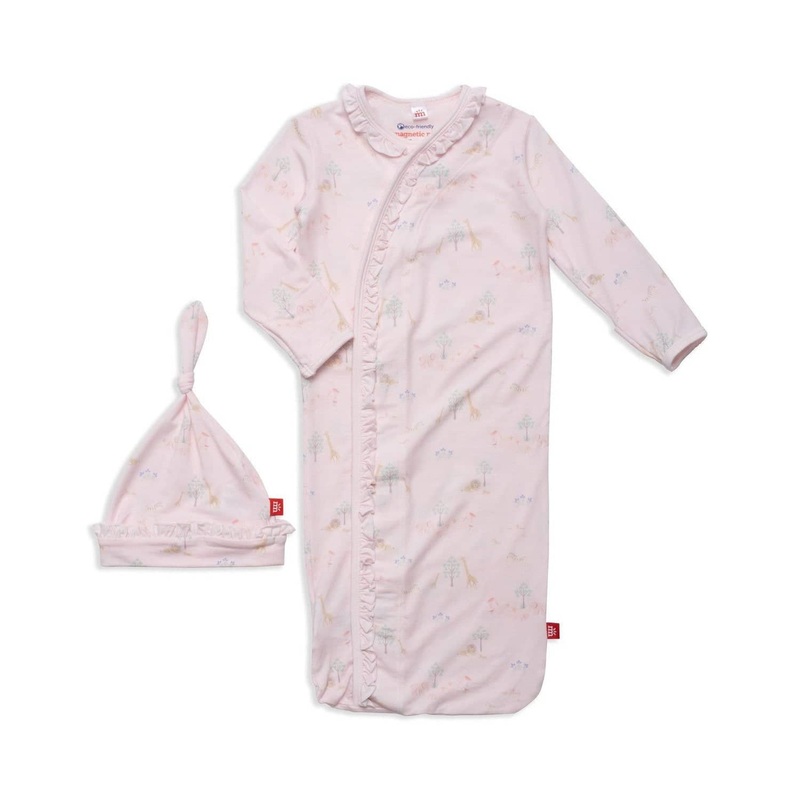 This magnetic sack gown, featuring time-saving magnetic fasteners and no over-the-head design, will have newborns dressed in a jiffy while significantly reducing their exposure to the chilly air. Quick diaper access at the bottom of the gown for frequent night changes makes life easier for new moms and dads. Includes matching reversible hat. Pairs perfectly with coordinating blanket and bib to make the ultimate baby gift for parent and baby.Modal is certified as a 100% Bio-based fabric by the US Department of Agriculture, responsibly farmed from Beechnut trees.