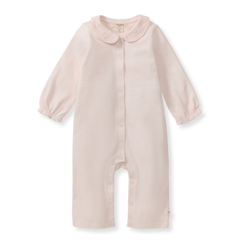 Elevate your little one's wardrobe with this sweet muslin collar jumpsuit!Long sleeve jumpsuit with a muslin collar100% organic cottonMuslin collar, jersey jumpsuitGathering at the sleevesSnap front opening for easy dressingMade in India