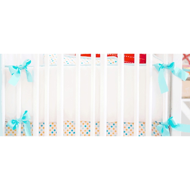 Orange, aqua and sweet polka dot pattern make for a cheerful nursery palette. Our Carnival Baby Bedding Collection can transform your nursery in to the happiest room in the house! The crib bumper is made of White Pique with Aqua Solid Ribbon ties, Aqua Solid cording, and is slip covered for easy cleaning.