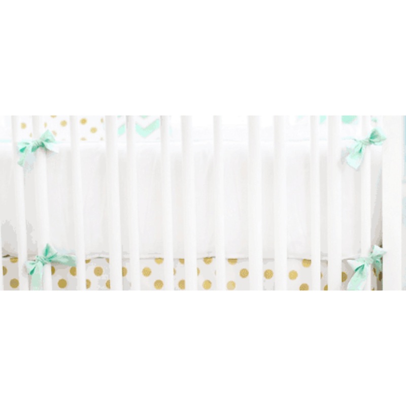 Gold is chic and the perfect neutral color for a nursery. Our gold and soft green baby bedding can work for a boy or a girl! The crib bumper is made from White Pique with Green Mist Solid ties and cording, and is slip covered for easy cleaning.