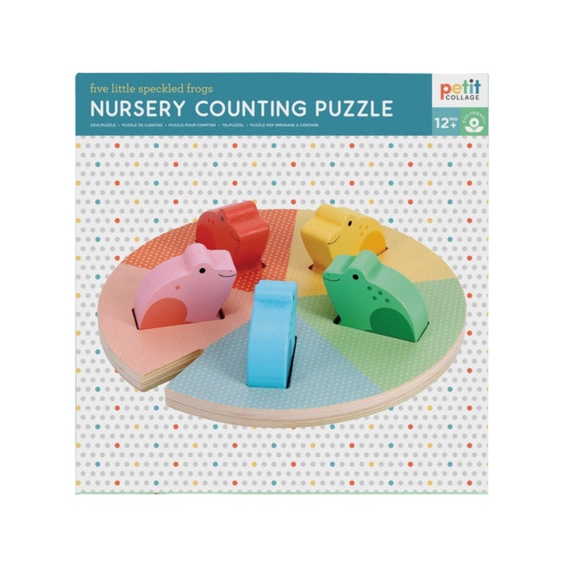 One, two, three, four, five little speckled frogs! This nursery rhyme puzzle lets little ones practice color matching and counting as they set the numbered frogs into place on a rainbow lily pad. The set includes one wooden lily pad base, five colorful wooden frogs, and a lovely nursery rhyme booklet for interactive singing or talking along while playing. Perfect for ages 12m+, this puzzle play set offers plenty of creative play to keep little ones entertained.