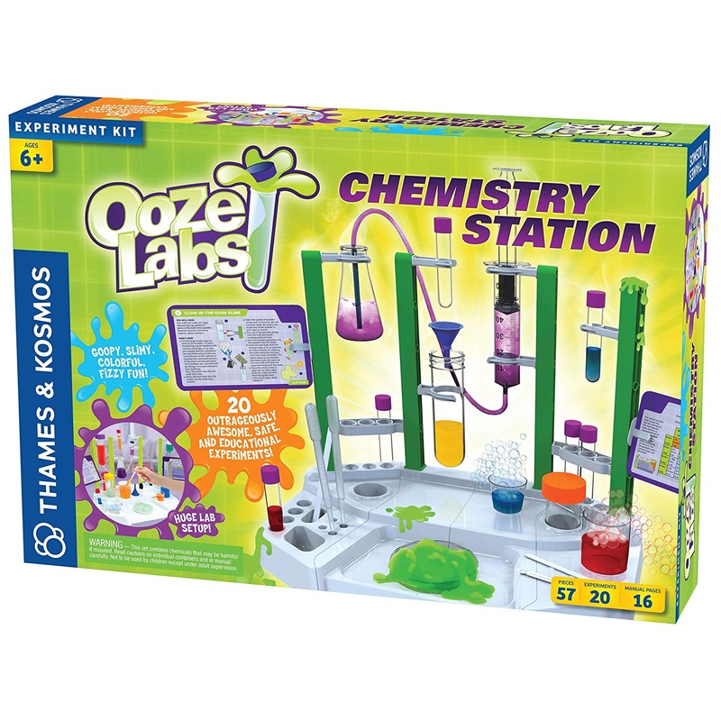 Grab your beakers and test tubes and step up to your special laboratory station for some exciting chemistry experiments. See how much fun chemistry can be as you do slimy, fizzy, colorful, and bubbly experiments. This cool laboratory setup has lots of different vessels and pieces of lab equipment so kids can play the role of chemist while doing real, safe experiments. All of the experiments use non-hazardous chemicals. This playful introduction to the basics of chemistry includes approximately 20 experiments. The experiments are presented on printed cards that can be clipped onto the lab station for easy reference. Experiments include glowing slime, color-changing slime, fizzing reactions, oozing bubbles, Rainbow in a test tube, chromatography, Cabbage juice pH tests, solutions, filtering, crystals, fire extinguisher, and underwater VOLCANO. The kit includes a large Plastic chemistry station, experiment cards, various vessels in different sizes, syringe, measuring cup, pipette, spatula, tube, petri dish, funnel, non-hazardous chemicals for the experiments, and experiment manual.