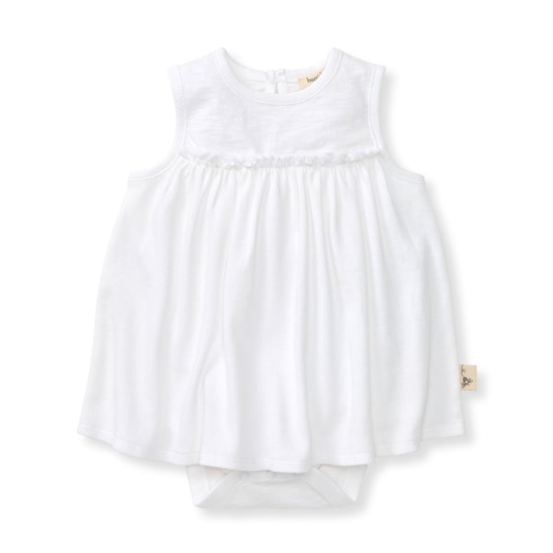 The quintessential summer dress for your little bee!Sleeveless dressSuper soft cottonKeyhole placket at back for easy dressingYolk seam for feminine detailReinforced snaps along the diaper line100% Organic CottonMade in India