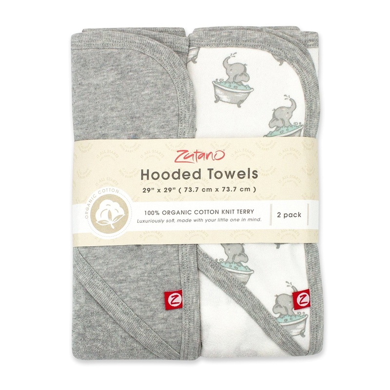 This hooded towel two pack features one towel with an elephant in a bathtub, printed on white, with heather gray trim, and one towel in solid heather gray.