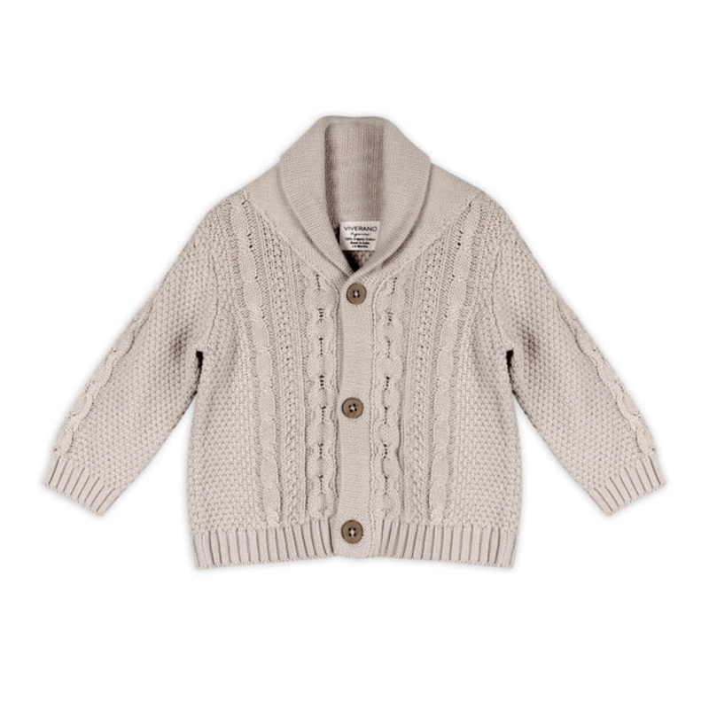 Organic Cotton Shawl Collar Cable Knit Baby Cardigan Sweater – Stone 0-3m