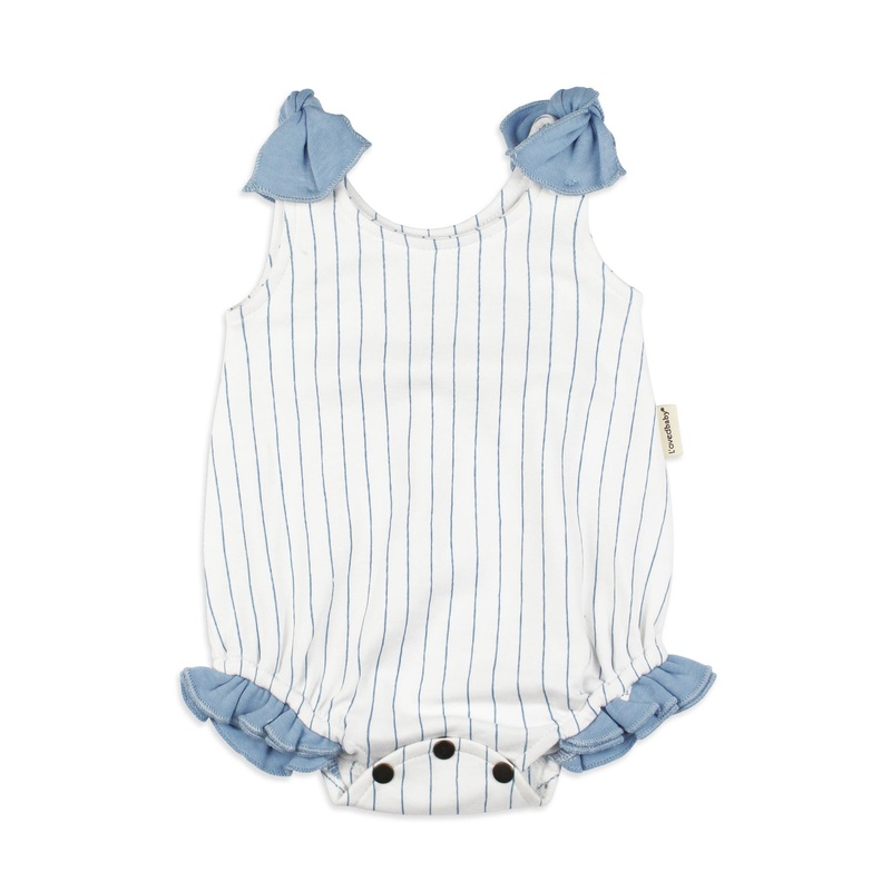 GOTS-certified 100% organic cottonadorable, decorative bow-tie detailing at shoulders, tethered for safetyhidden snaps at shoulders for easy dressingsoft elastic around the thighs for baby's complete comfort, with sweet ruffle detail for added charm and cu
