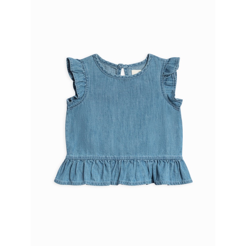 The Anya Chambray Ruffle Hem Top is a sweet and stylish piece your little one will love. With ruffle sleeves and a playful ruffle hem, this top is as cute as it is comfy. The back keyhole button closure makes dressing easy, while the soft organic cotton chambray keeps her cozy all day long. Pair it with the Callie Chambray Ruffle Waist Short or the Luz Muslin Flutter Shorts for a different texture!