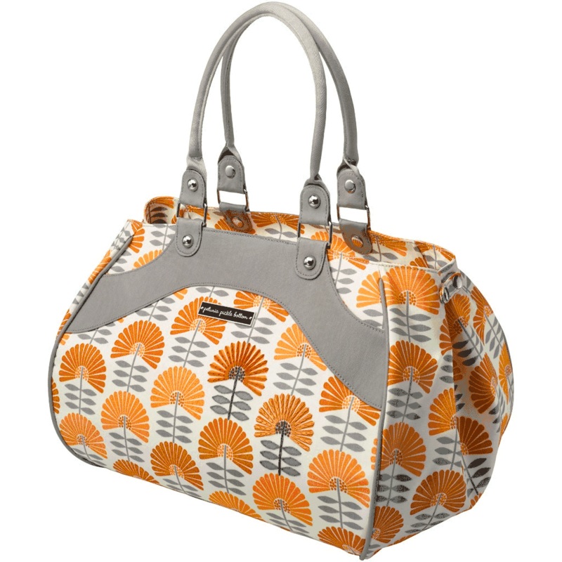 • Tangerine, flame and slate mod floating flower design on Glazed coated cotton canvas with tangerine and slate embroidered detail. Slate water-resistant lining and handles.