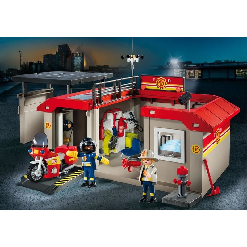 Red alert at the Take Along Fire Station! The firefighters are on the move and ready to race to the rescue. In a convenient take-along case, this set is perfect for on-the-go fun. Transform the front grey panel into a helipad/garage and rearrange some wall pieces to transform this convenient take-along set into a Fire Station ready to respond to those in need. Set includes two firefighters, motorcycle, helmet and other fire gear, fire hydrant, fan, fire extinguisher, command desk, chair, bunk beds, security camera, and tons of other accessories.