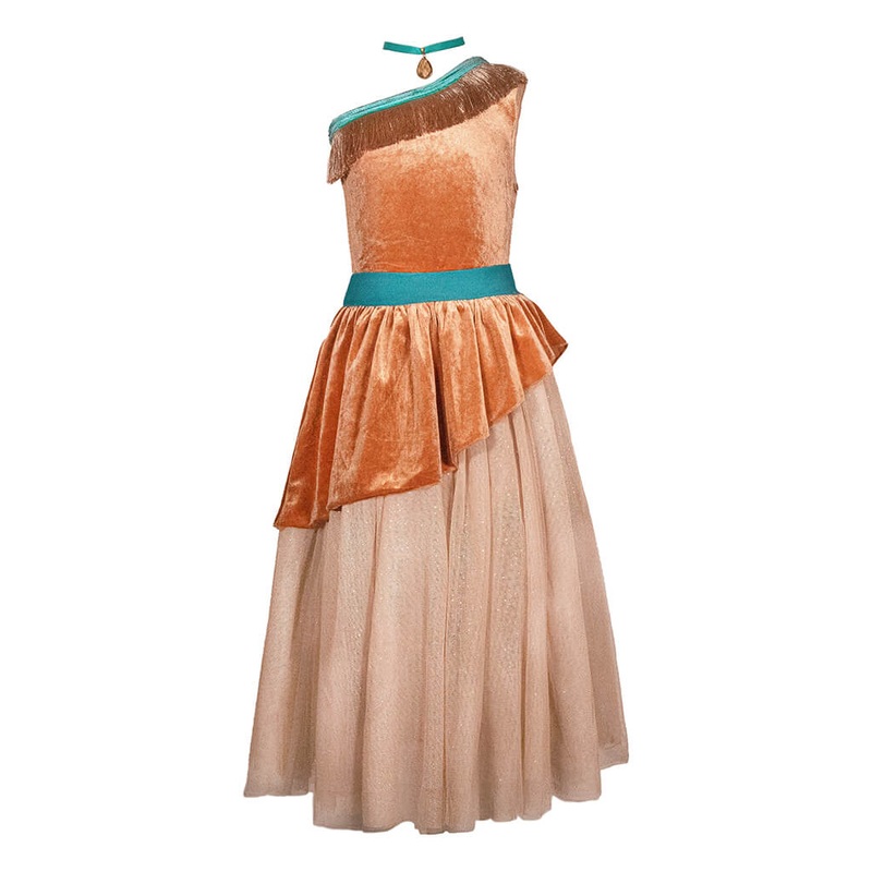 Highlighted with a golden fringe trim, this dress sparkles with every movement, capturing the essence of Pocahontas’ adventurous spirit. As a finishing touch, the dress includes a beautiful necklace, reminiscent of the one Pocahontas’ mother bestowed upon her, adding an extra touch of authenticity and magic to this enchanting ensemble.