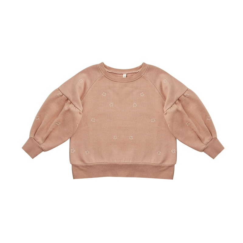 We're bringing back an old favorite in this puff sleeve sweatshirt that puts a fun spin on a classic, cozy piece. Featuring our 'star' all-over embroidery on dusty rose. Machine wash cold. Tumble dry low. Made of 70% cotton, 30% polyester