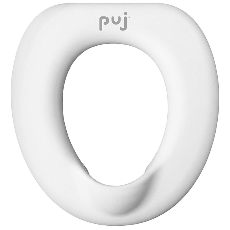 Designed as one solid piece, there are no crevices, creases, or cracks to clean! The Puj Easy Seat Toilet Trainer fits most toilet seats and has a built-in splash guard to help keep your bathroom and child clean. Light weight material allows for easy hanging and storage ? your kids can even do it themselves! Compact design ? perfect for storage and travel. Ultra soft material ? durable, non-absorbent, non-staining, and non-slip.