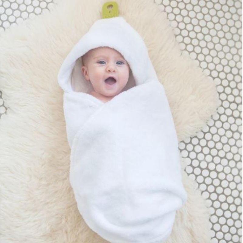 Using the Hug is easy. First connect the two tabs around your neck. Then pick up baby and place them on your chest face down. Unlatch the hooded side of the towel and gently wrap it around babys head. The baby is now completely covered and can be safely cradled in your arms and carried to a changing table.