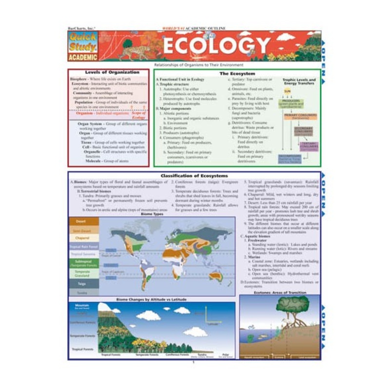 Covers the study of relationships of organisms to their environment. Great for students in biology at any level, general or physical science, or any science that includes life and geographic relationships. 6 -page laminated guide includes: levels of organi