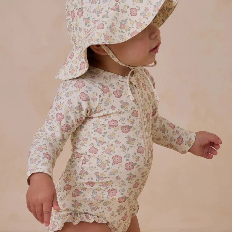 This one-piece rashguard swimsuit will keep your little one protected from the sun in style. Featuring a back zip closure and ruffle detail at the leg openings.*Bottom snaps included on sizes 0-3M - 18-24m.UPF 50+Featuring our bloom print on our 'ivory' hu