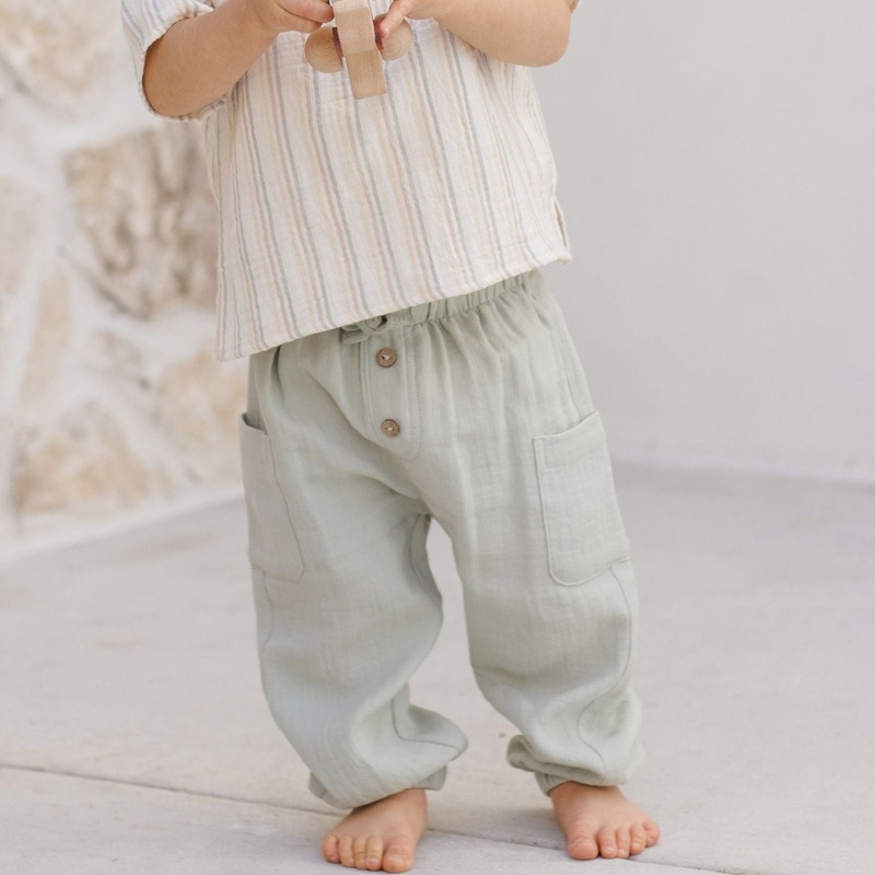 Comfortable woven pants featuring an elastic waistband and leg openings, adjustable drawstring, and side pockets.Care: Machine wash. Lay flat to dry.Made of 100% organic cotton.