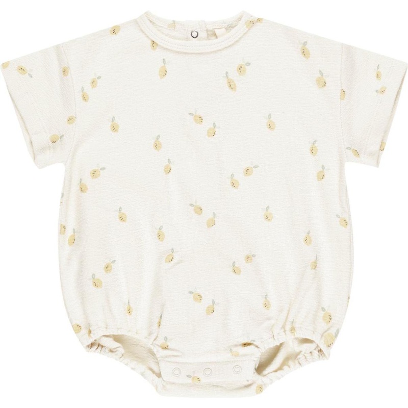 Short sleeve bubble romper in our fun spongey knit that is a sure season go-to! Featuring a bottom snap closure and back neck snaps for easy changing. Featuring our lemons print on our ivory hue. This citrusy sweet print is perfect for sunny days. Care: Ma
