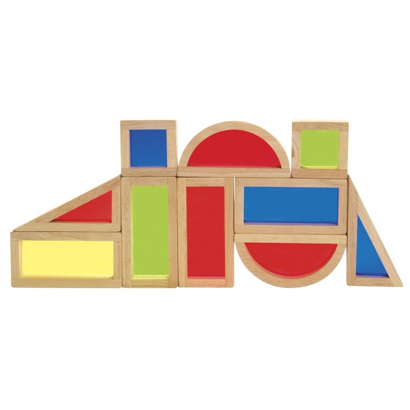 Smooth hardwood blocks, sized to complement classic block sets, feature transparent windows of strong plexi-glass in beautiful colors. A great way to introduce children to principals of color and light. Ages 3 years and up.