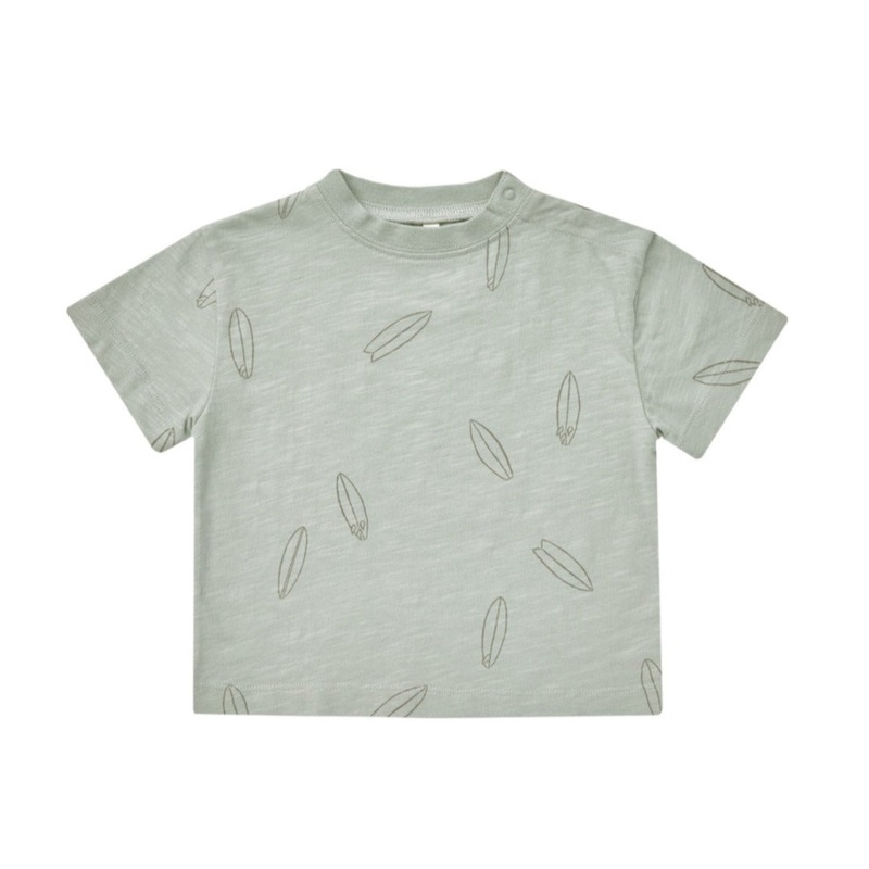 Relaxed fit tee made from the softest cotton jersey. Baby sizes 0-3m thru 6-12m have snaps at the shoulder for easy changing.Featuring our 'surfboard' all over print in seafoam.Care: Machine wash cold. Tumble Dry low.Made of 100% Cotton