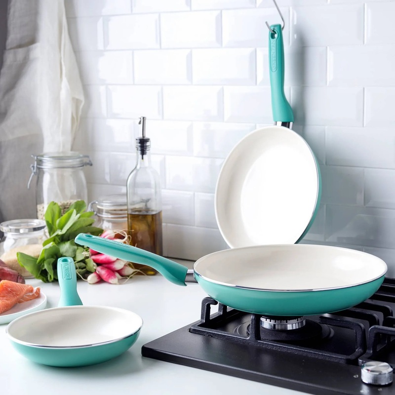 Add a touch of color to your kitchen with this vibrant set of frypans from the GreenPan Rio collection. This versatile set is perfect for a huge array of kitchen tasks, from early morning eggs to late-night snacks and everything in between. And its designed to make any dish better. How? This pan features GreenPans Thermolon healthy ceramic nonstick coatingan easy release and wipe clean coating thats free of PFAS, PFOA, lead, and cadmium for worry-free cooking. Unlike many other nonstick coatings, it will never release toxic fumes, even if its overheated. This durable coating is reinforced with diamonds to provide peak nonstick performance longer. The pans heavy-duty construction gives you even heat distribution while the stay-cool Bakelite handle give you a comfortable grip and total control. This cookware set includes 7″, 9.5″, and 11″ frypans. Dishwasher safe. Each pan is oven safe to 350F. Limited lifetime warranty.