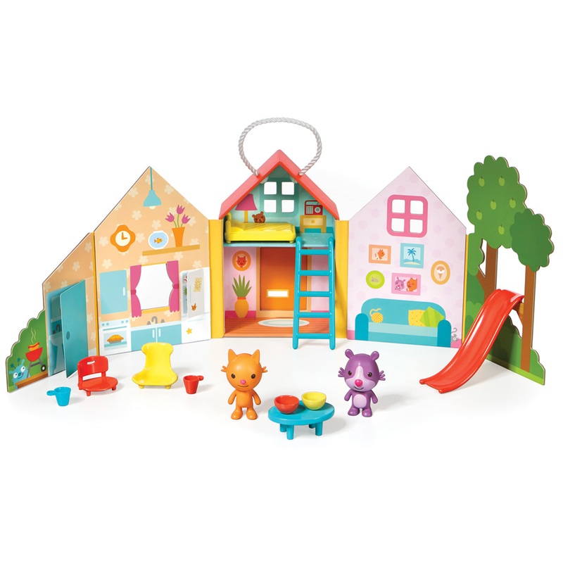 Join Rosie on a play date at Jinja's house. This adorable little house folds up and stores everything inside. It even has a handle to make it easy to grab and go! Take it on a trip to grandma's, to a restaurant or over to a friend's house. Wherever you go,