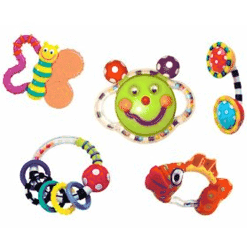 0-12 Months. Five-piece rattle and teether set provides plenty of color, texture, sound, and movement. Stimulates baby's senses and encourages development. Miniature design is perfect for infant's tiny hands. Includes goo goo goldfish, phone rattle, circle